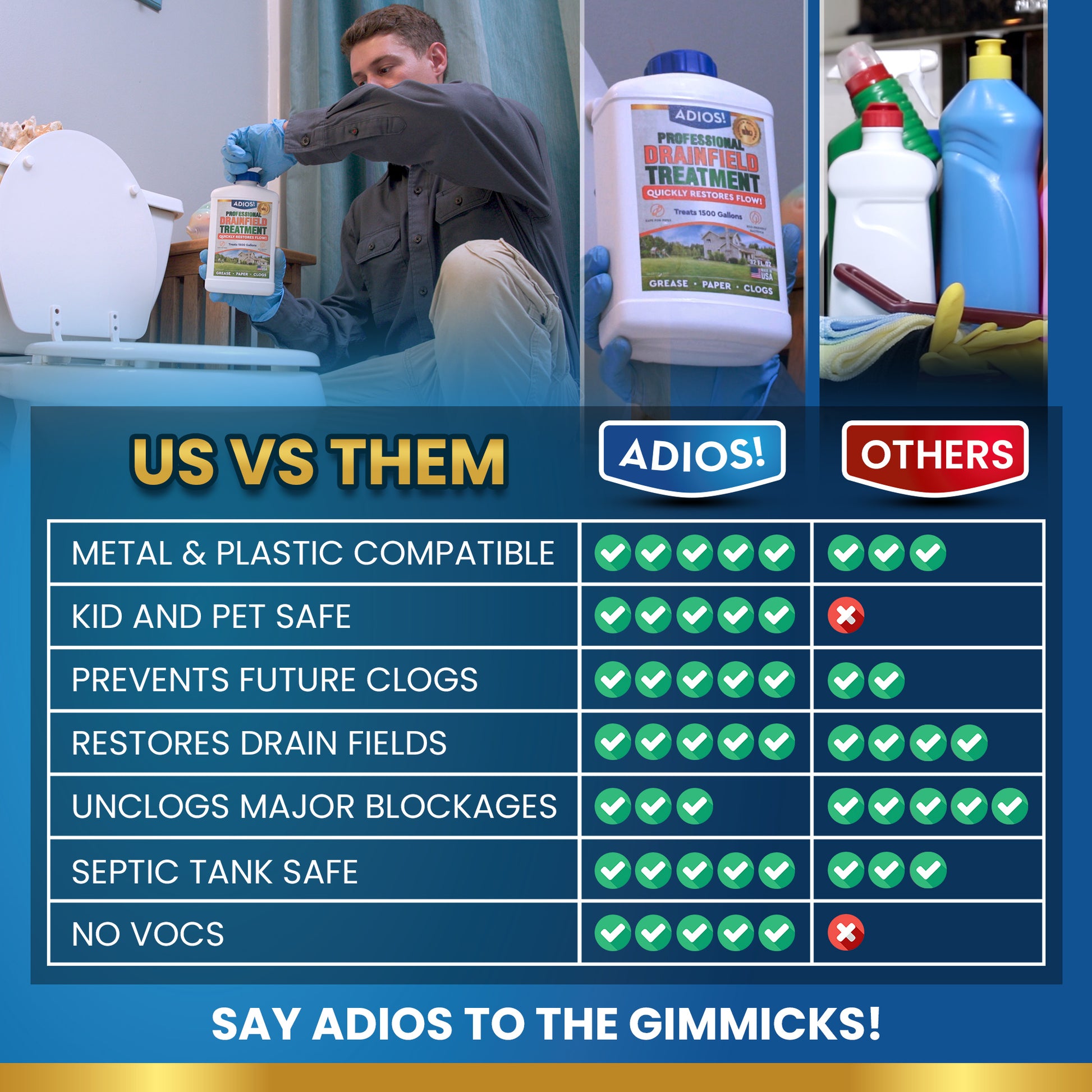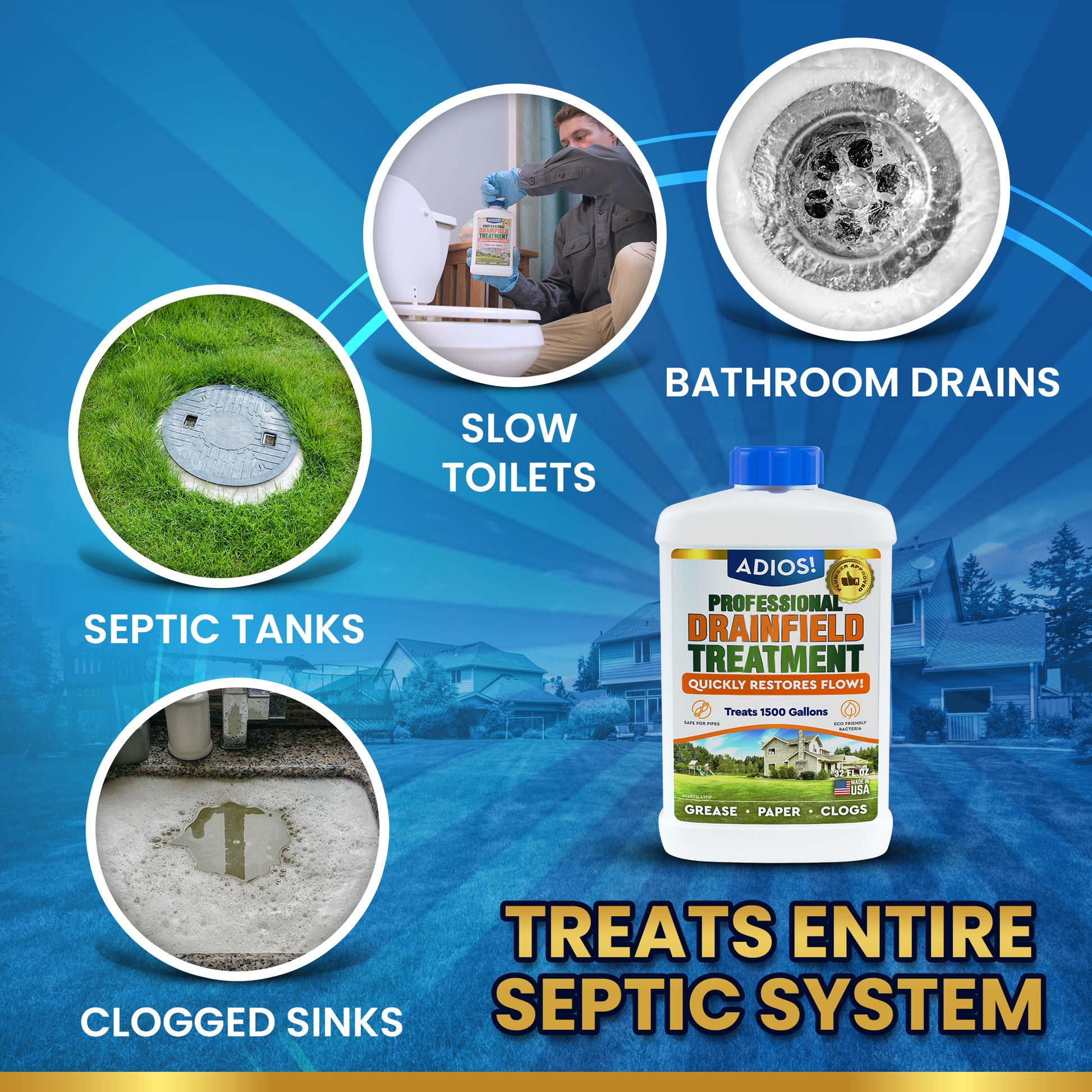 While box-store drain openers may help in a pinch, they do not attack the problem at the source. Adios! Drain Field Treatment goes deep into your drain pipes, septic tanks and drain fields and work around the clock to break down clogs. Just once a month maintenance can prevent slow drains from becoming an issue.