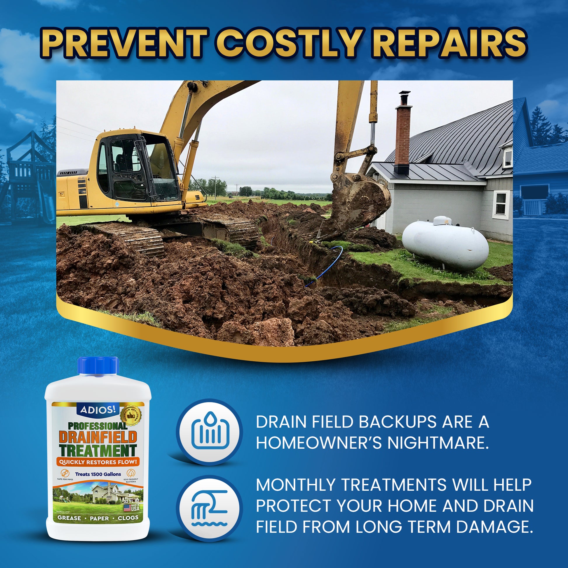 Adios! Drain Field Treatment is a safe and effective way to restore and improve flow to leach fields and drain fields without damaging your pipes or septic tank. Using a natural enzyme based formulation, our field treatment naturally breaks down deposits of fat, grease, hair and other organic material that have built up over time and cause slow drainage in fields.